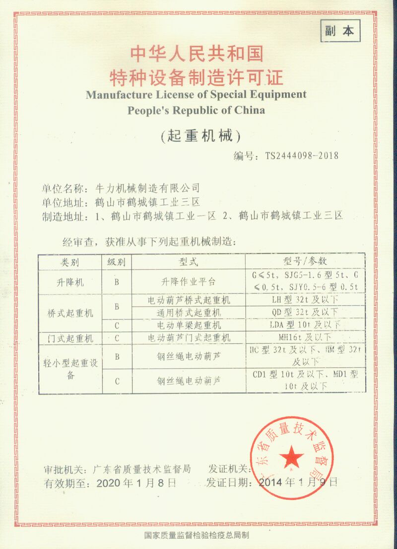 • 升降機(jī)特種設(shè)備生產(chǎn)許可